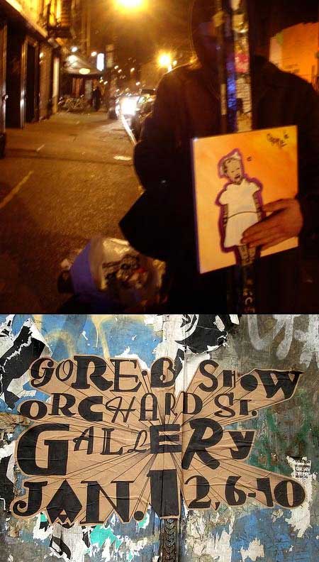 Gore.b left the texas trains and came to NYC a few years ago, since his invasion NYC's poles have been filled with ever evolving gore.b art. Gore.b is infamous here at the gallery for the demolishing blows his thought provoking doodles created when he illustrated London's prominent figure heads helping the USA win Vs. the UK in "Doodledown: A transatlantic